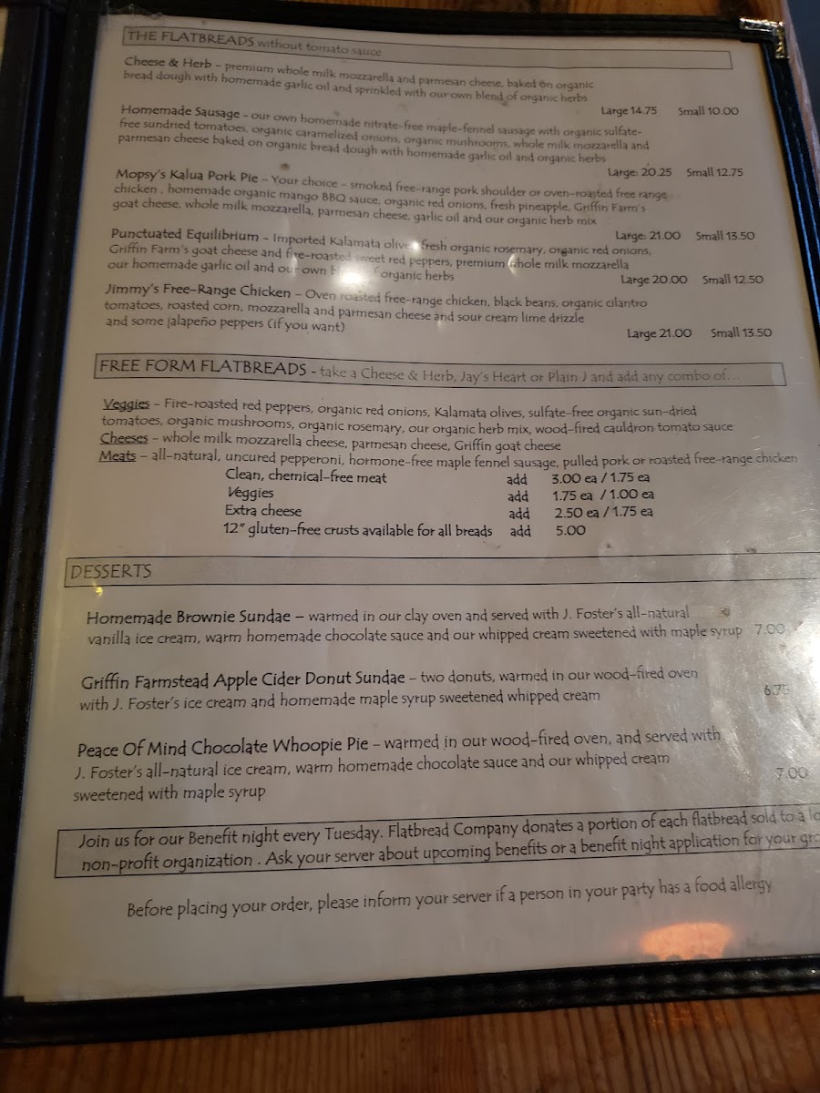 Overall, American Flatbread's menu offers a diverse range of delicious options, ensuring that every diner finds something they love, from savory flatbreads to sweet desserts and refreshing drinks.